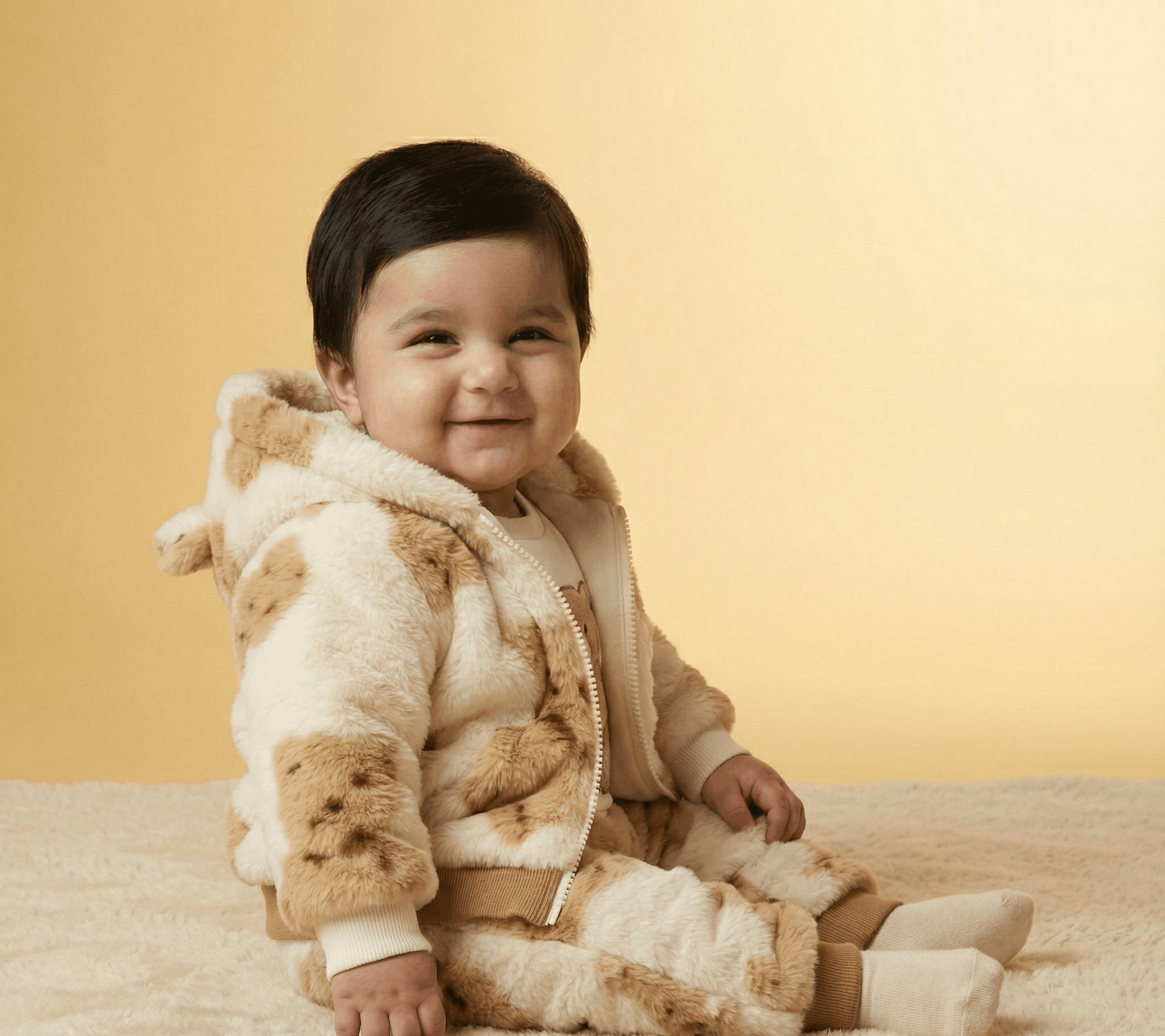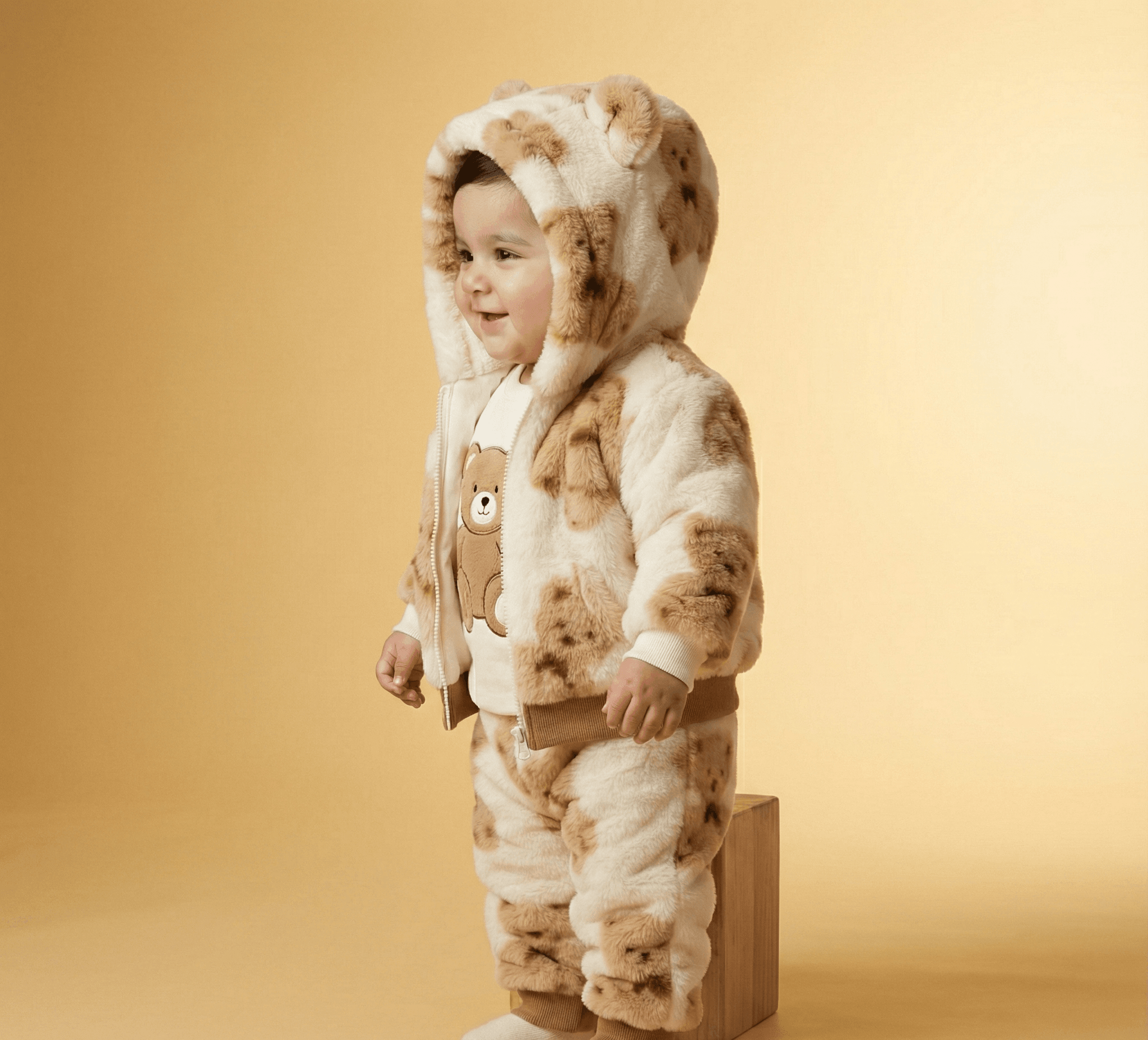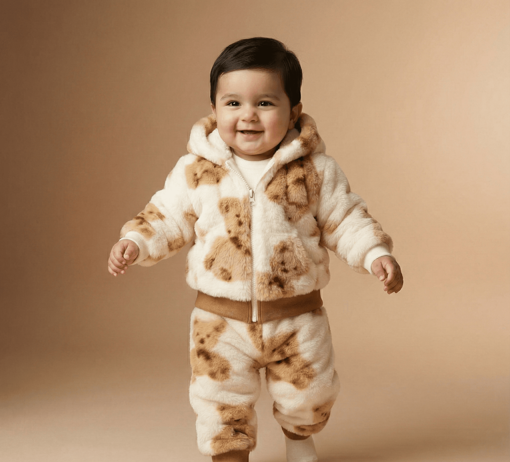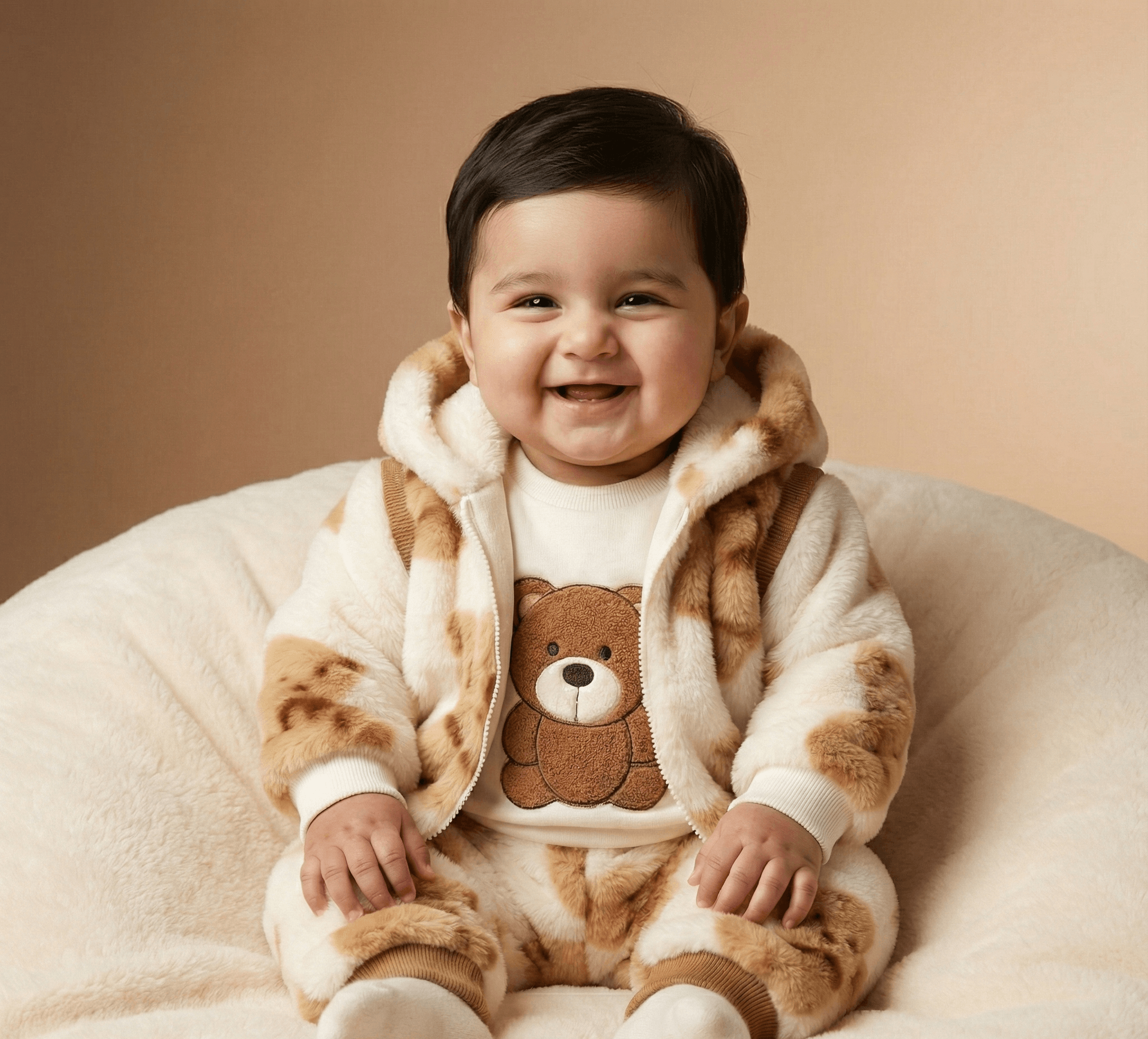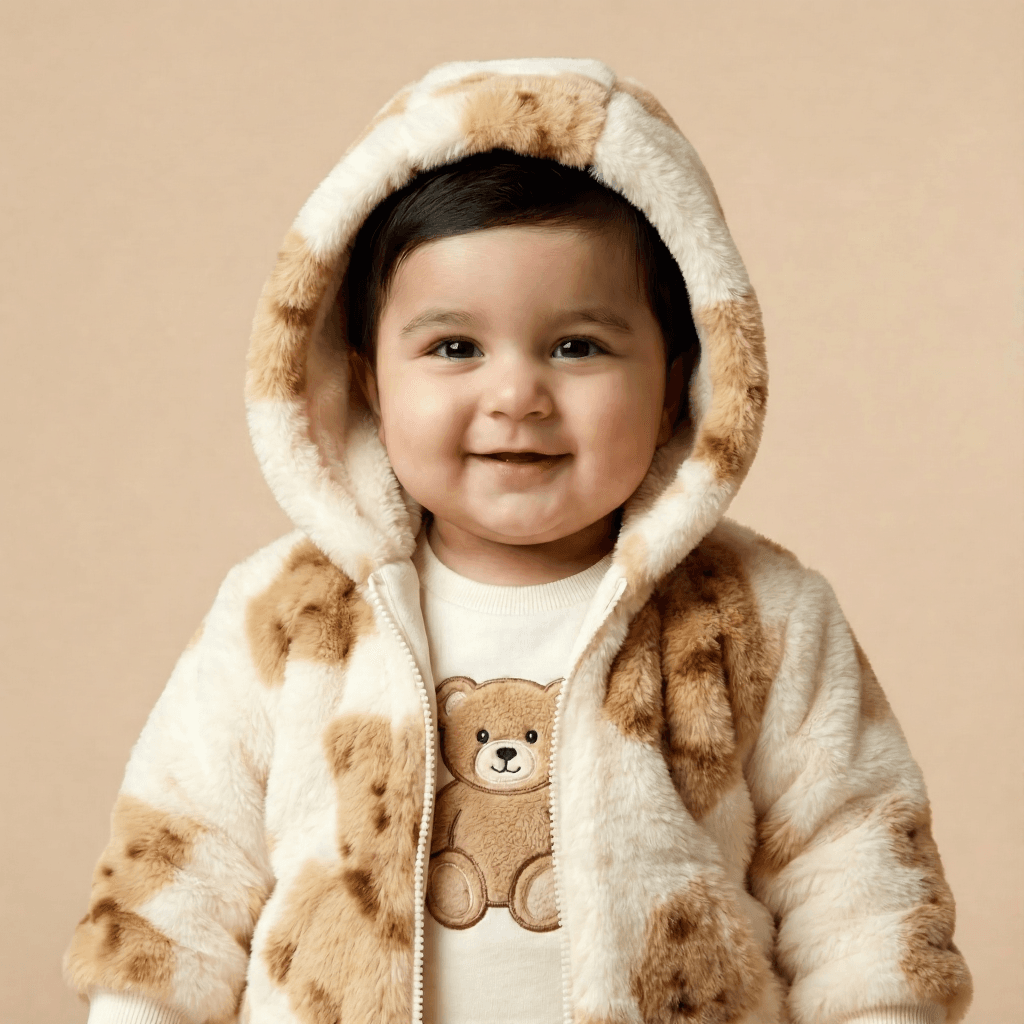 Wrap your little one in the cozy embrace of our “Bear Hug” Plush Romper. This adorable one-piece suit is the perfect combination of warmth and whimsy, featuring a beautiful white and brown color palette adorned with friendly teddy bear illustrations. The hooded design is not just for style; it features soft 3D bear ears and a plush lining to keep your baby’s head protected from the chill. Made from high-quality, ultra-soft synthetic fur, this romper is designed to be lightweight yet insulating, allowing your baby to move, crawl, and nap in total comfort. Whether you are heading out for a winter walk or staying cozy at home, this romper ensures your baby stays snug, happy, and incredibly cute.