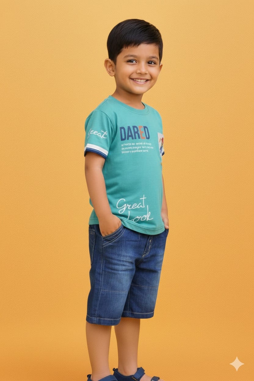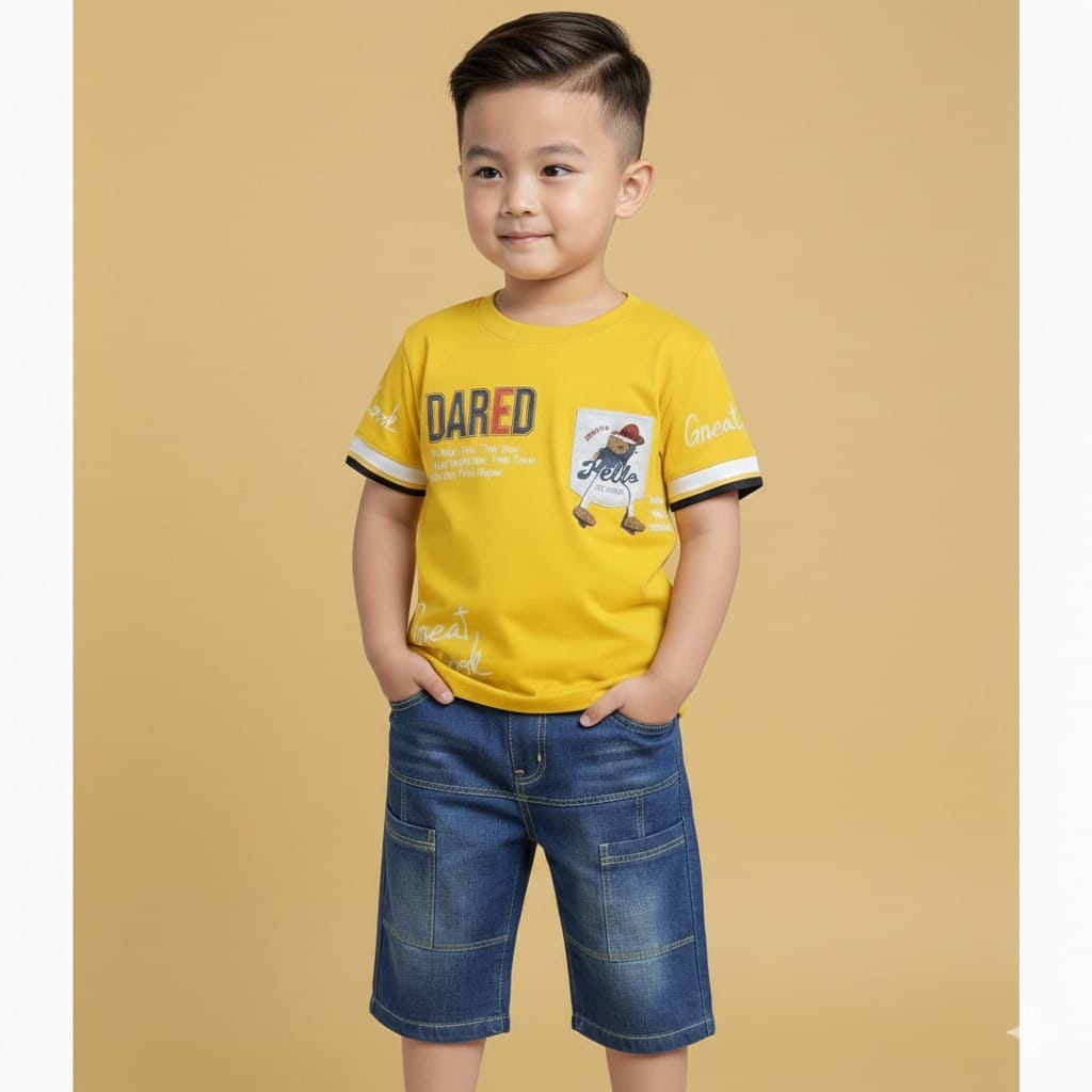 - Dynamic Graphic Tee: Featuring a striking “DARED” chest print and a playful “Hello” bear pocket detail, this yellow & Green shirt is all about personality.
