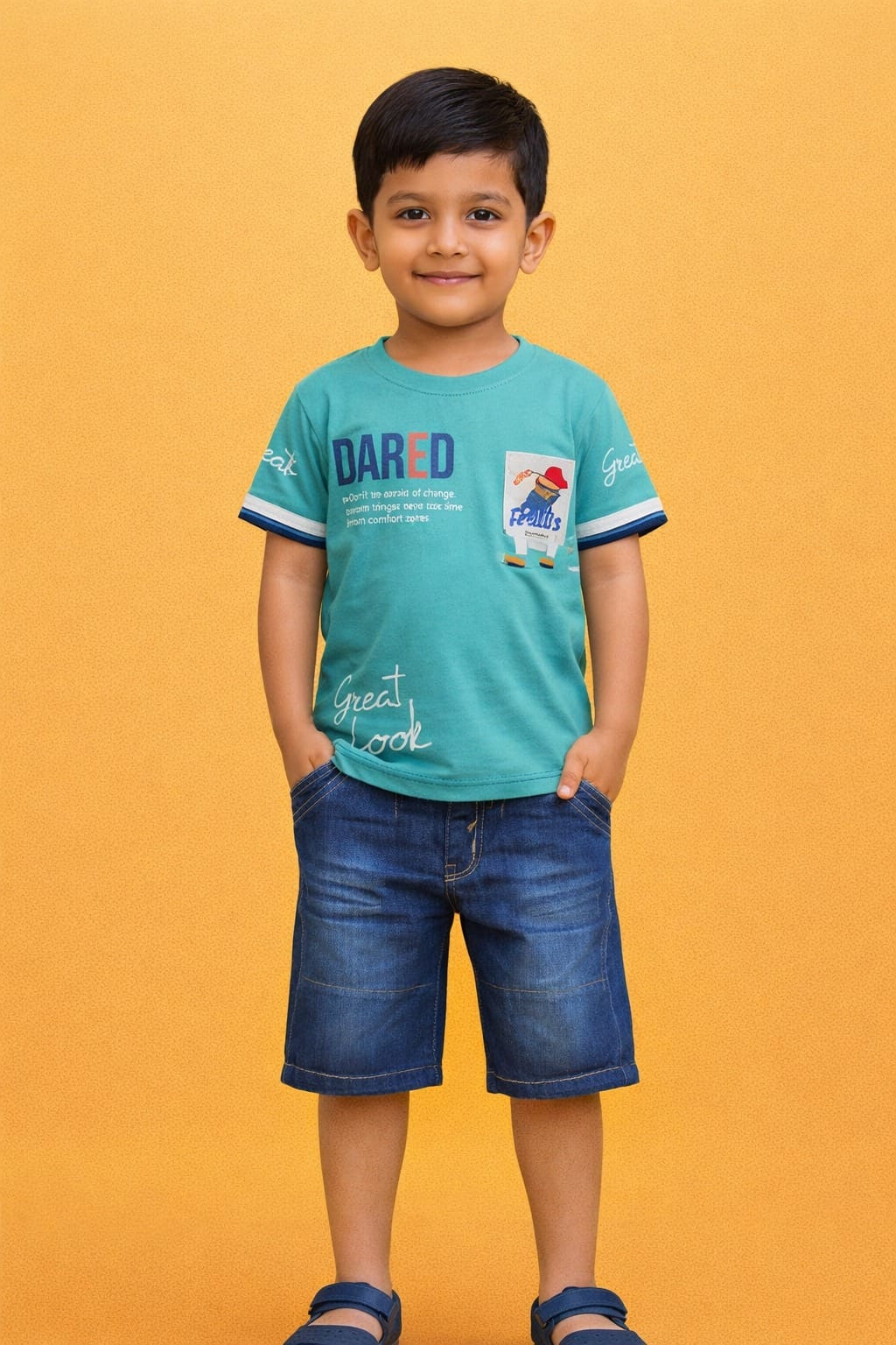 Dynamic Graphic Tee: Featuring a striking “DARED” chest print and a playful “Hello” bear pocket detail, this yellow & Green shirt is all about personality.