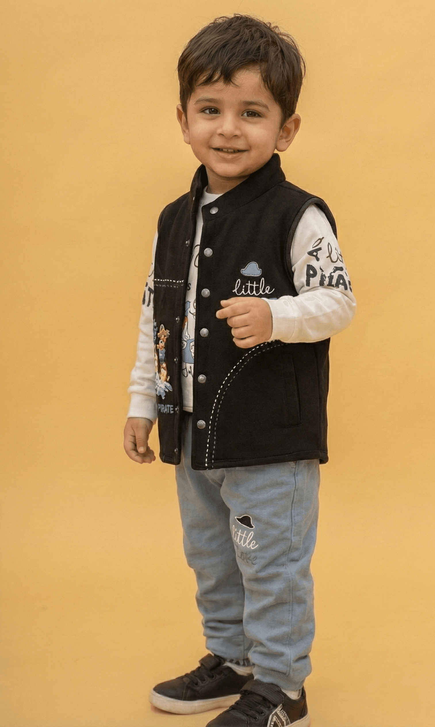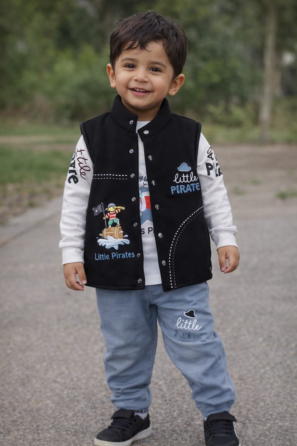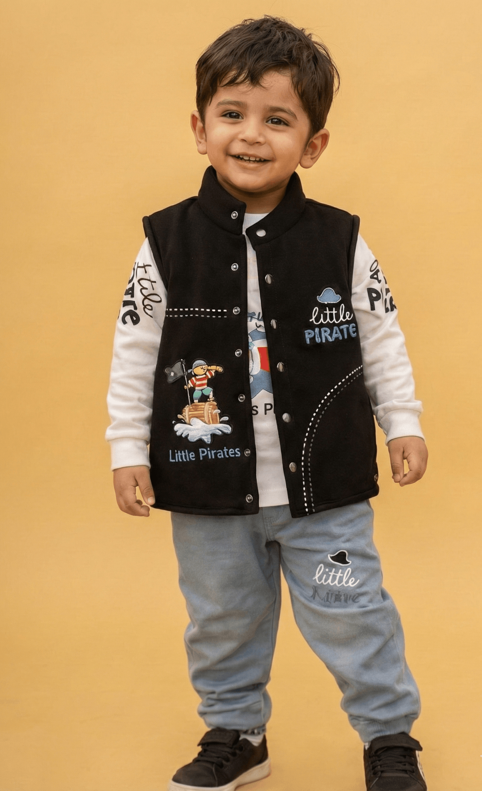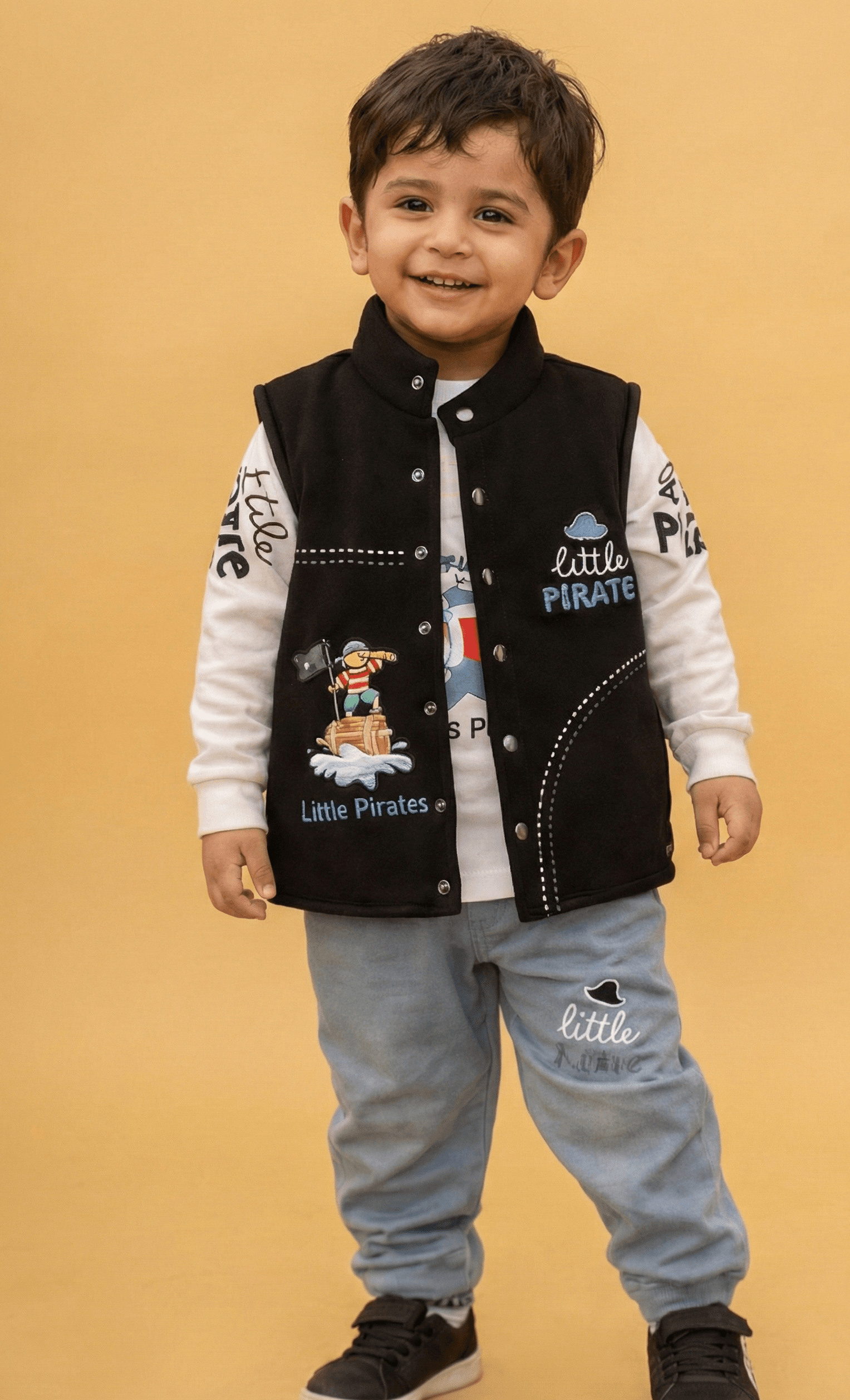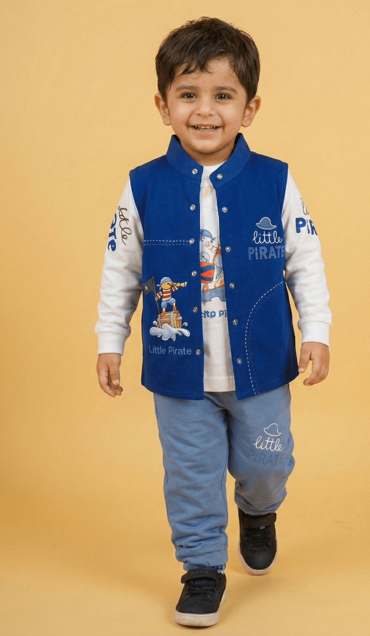 Set sail for adventure with this charming 3-piece boys’ coordinated set, perfect for active toddlers and young boys. This ensemble features a vibrant royal blue waistcoat (vest) crafted from durable fabric, prominently featuring a cute “Little Pirate” patch and thematic white stitching. Layered underneath is a soft, long-sleeved white jersey shirt decorated with playful pirate-themed typography and colourful graphics. To complete the nautical look, the set includes matching light blue joggers that are elasticated at the ankles for a comfortable, secure fit during all-day play. This outfit combines a sharp, layered appearance with the breathable comfort needed for outdoor fun or casual family gatherings