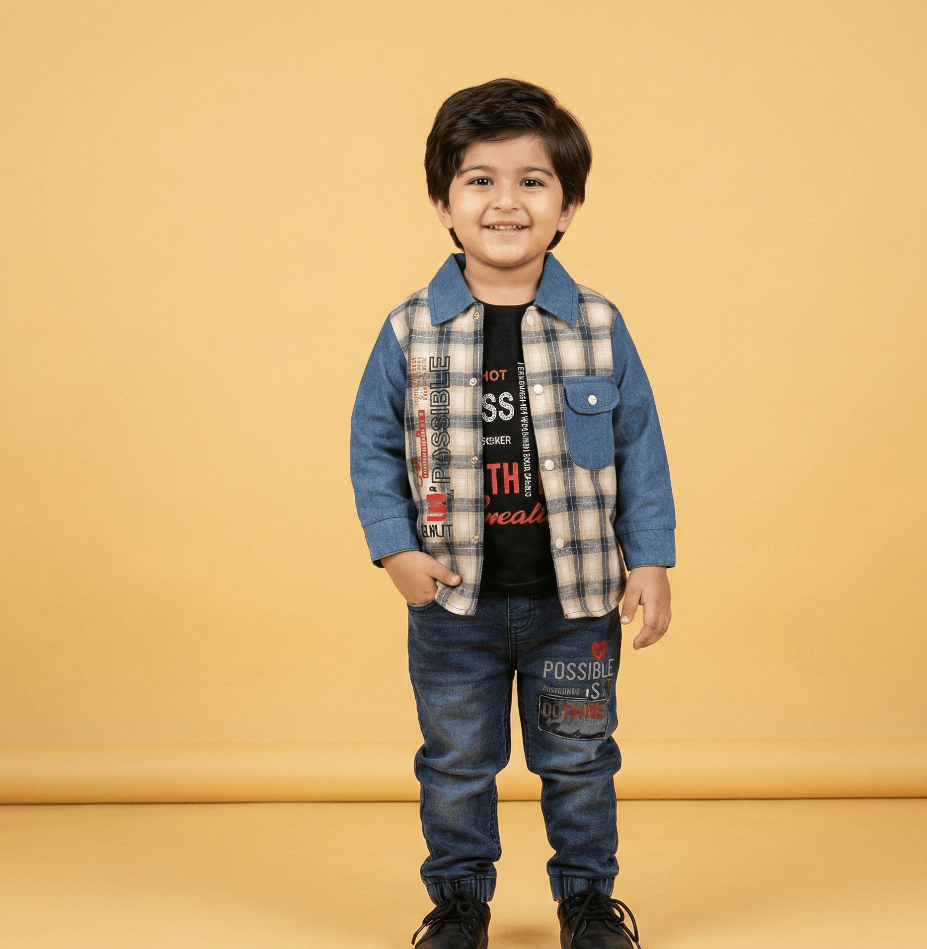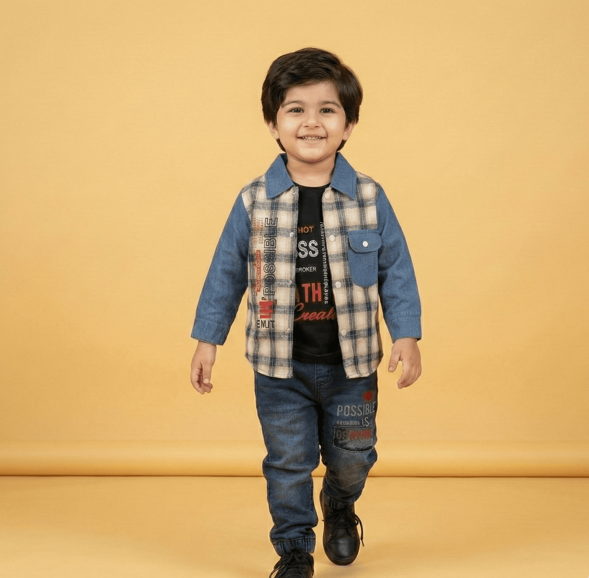 Dress your young man in style with this sophisticated 3-piece boys’ formal suit. This set features a high-quality jacket crafted from China Yarn Dyed fabric, showcasing a timeless blue and beige check pattern that adds a classic touch to a modern silhouette. Layered underneath is a comfortable inner shirt made from Mandis fabric, featuring bold graphic typography for a contemporary edge. The look is perfectly balanced with matching slim-fit denim trousers that feature coordinated graphic accents, ensuring a cohesive and fashionable ensemble. Whether for a family wedding, a formal dinner, or a festive celebration, this durable and stylish set provides a polished look without sacrificing comfort.