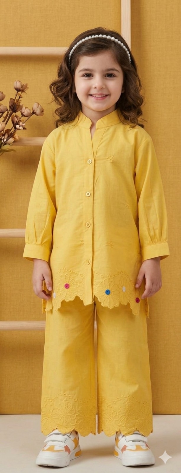 Detailing: The trouser hems mirror the top with matching scalloped embroidery, creating a cohesive and high-end look.