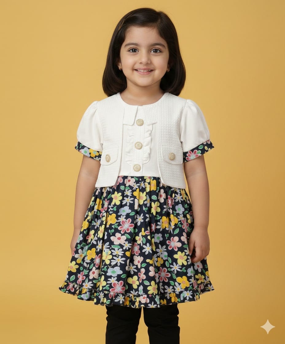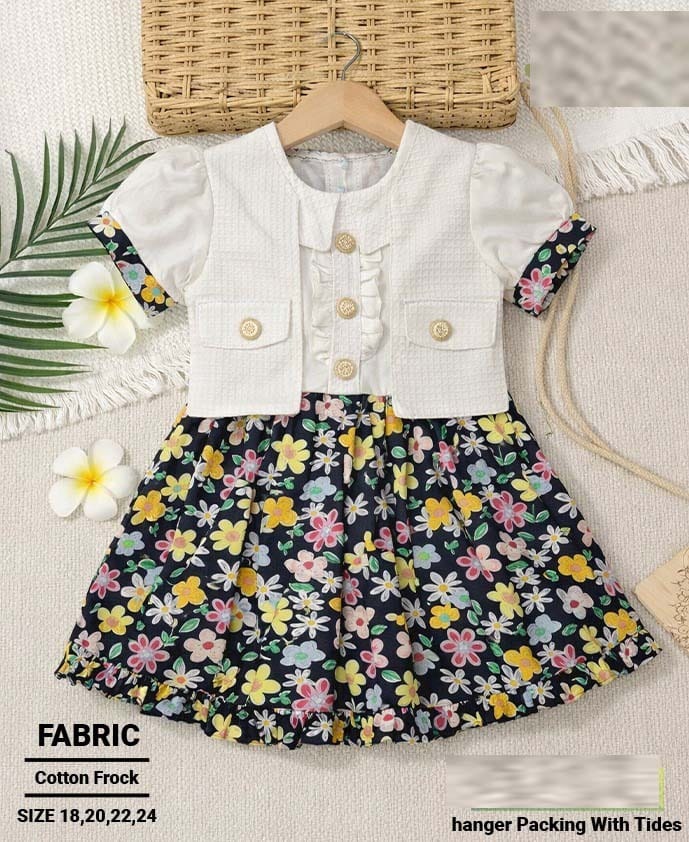 Elevate your little one’s wardrobe with this sophisticated and charming two-piece style cotton frock. Designed for the modern young fashionista, this ensemble blends classic tailoring with playful floral patterns, making it perfect for parties, family gatherings, or special occasions.