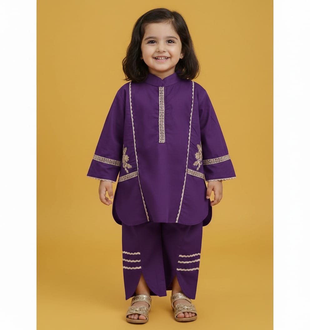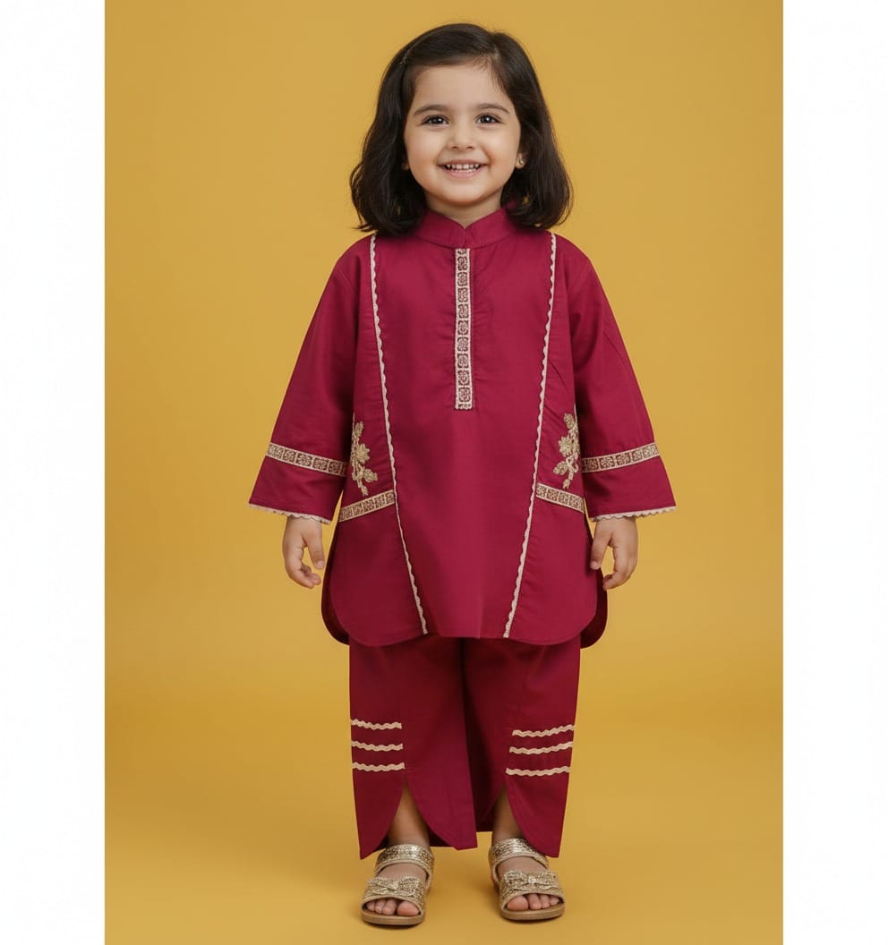 Elevate your little girl’s festive wardrobe with this stunning deep magenta ensemble. Designed specifically for comfort without compromising on style, this outfit features a contemporary take on traditional Pakistani wear. The rich jewel tone paired with a vibrant mustard-inspired aesthetic makes it a standout choice for weddings, Eid, and family celebrations.
