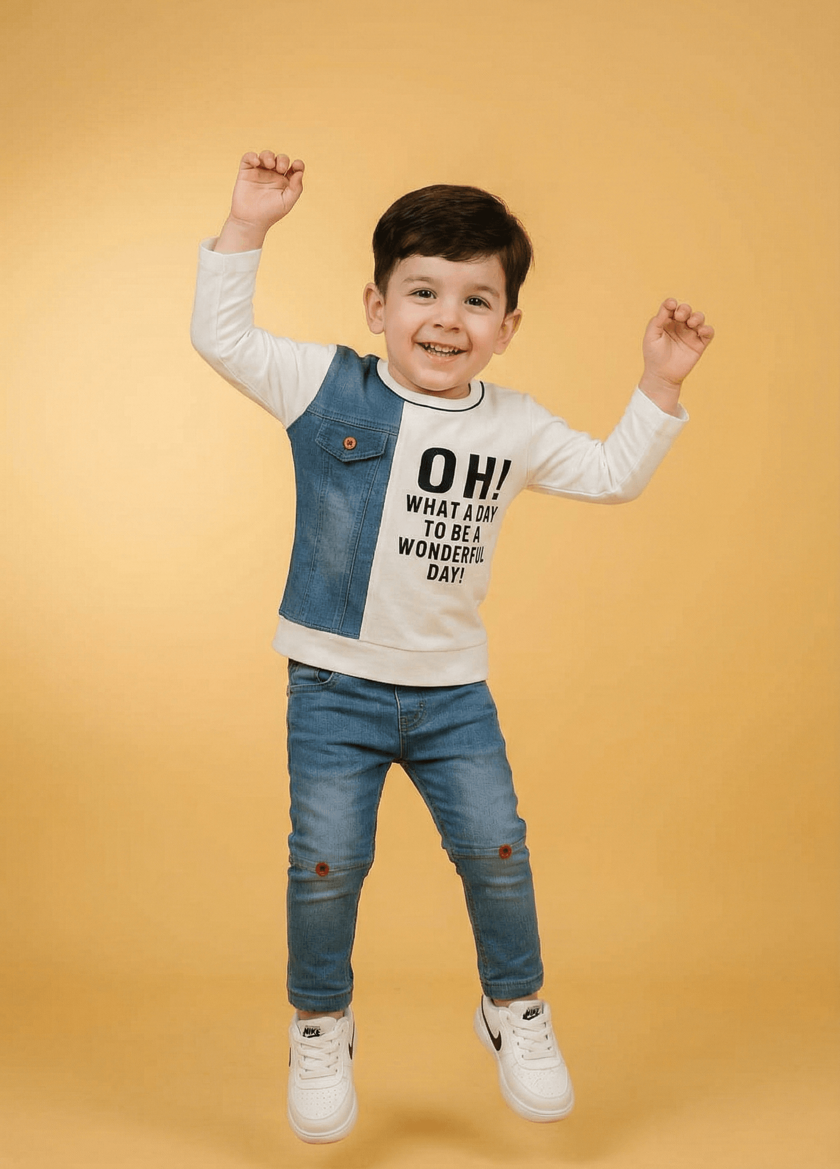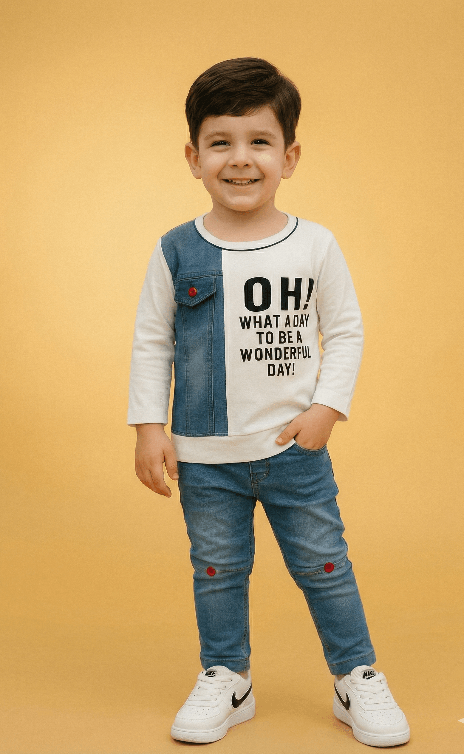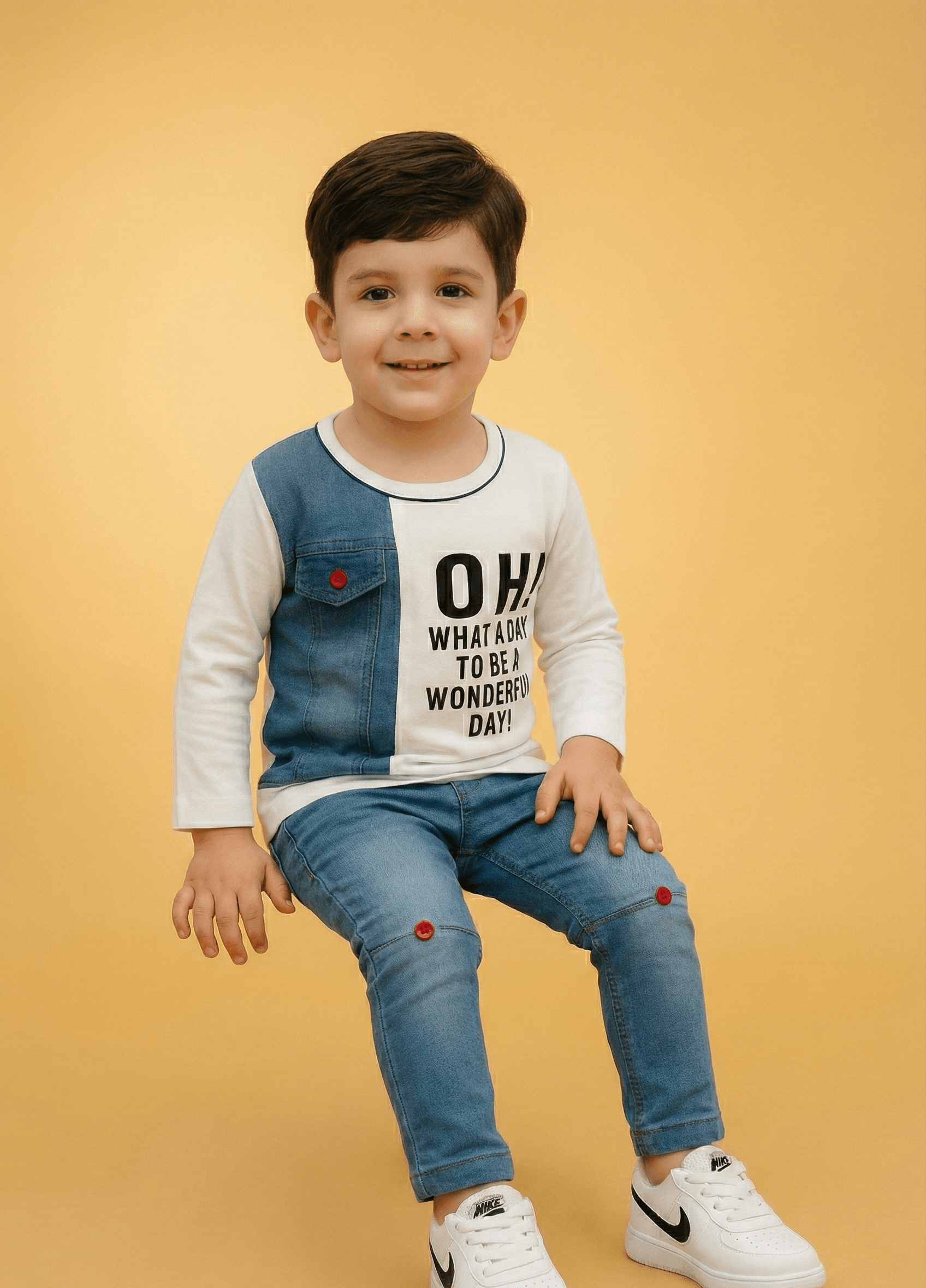 Give your little one a fresh and modern look with this high-quality 2-piece coordinated set. The outfit features a long-sleeved white sweatshirt crafted from soft, breathable fabric, highlighted by a unique contrast denim panel on the shoulder and a functional button-down pocket. The chest features a bold, inspirational graphic that reads, “OH! WHAT A DAY TO BE A WONDERFUL DAY!” perfectly capturing a positive vibe. It is paired with premium Slub Lycra Denim jeans that offer a superior stretch for all-day comfort. These trousers are detailed with stylish horizontal knee paneling and decorative red button accents, ensuring your child stays at the forefront of contemporary kids’ fashion.
