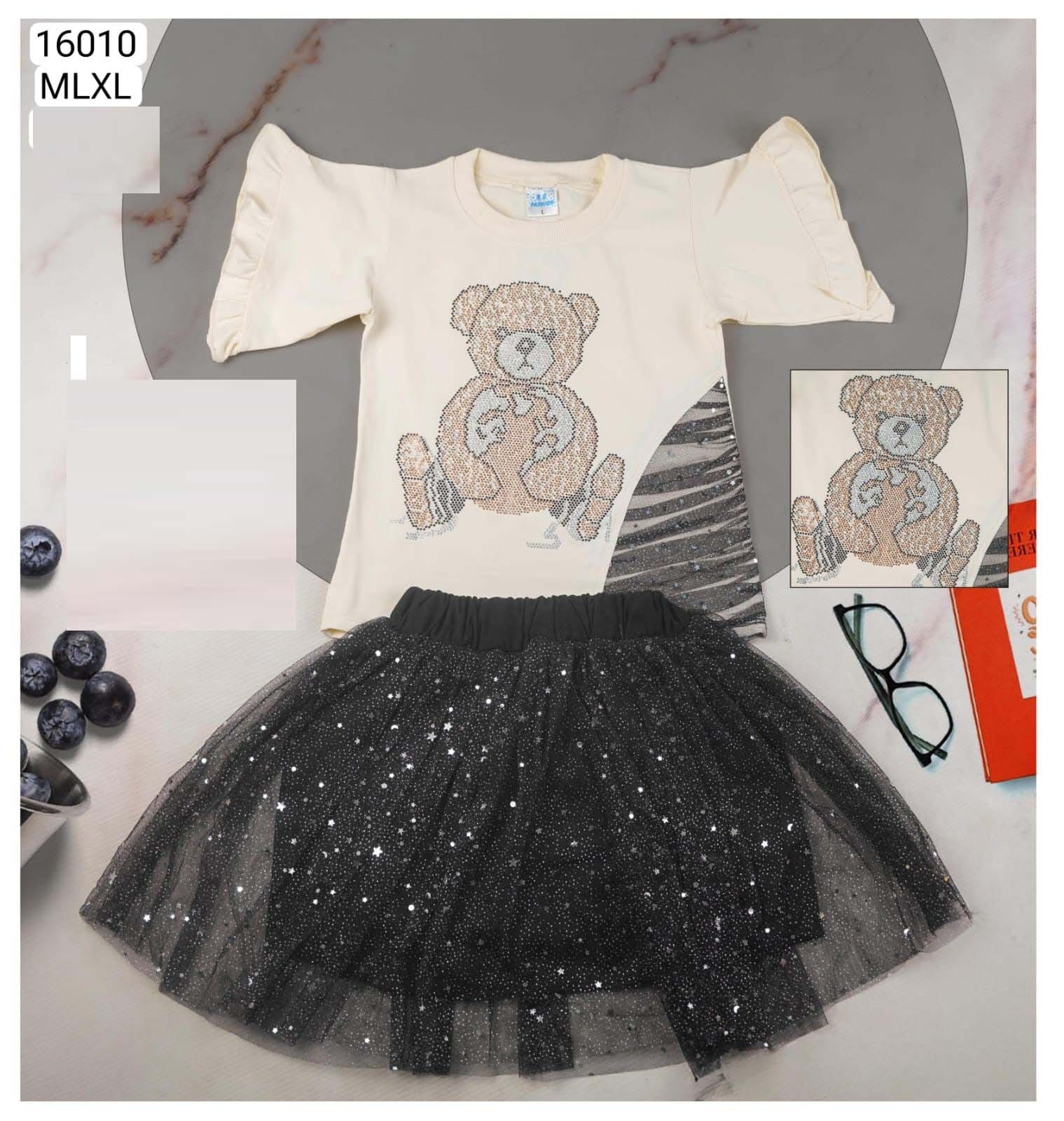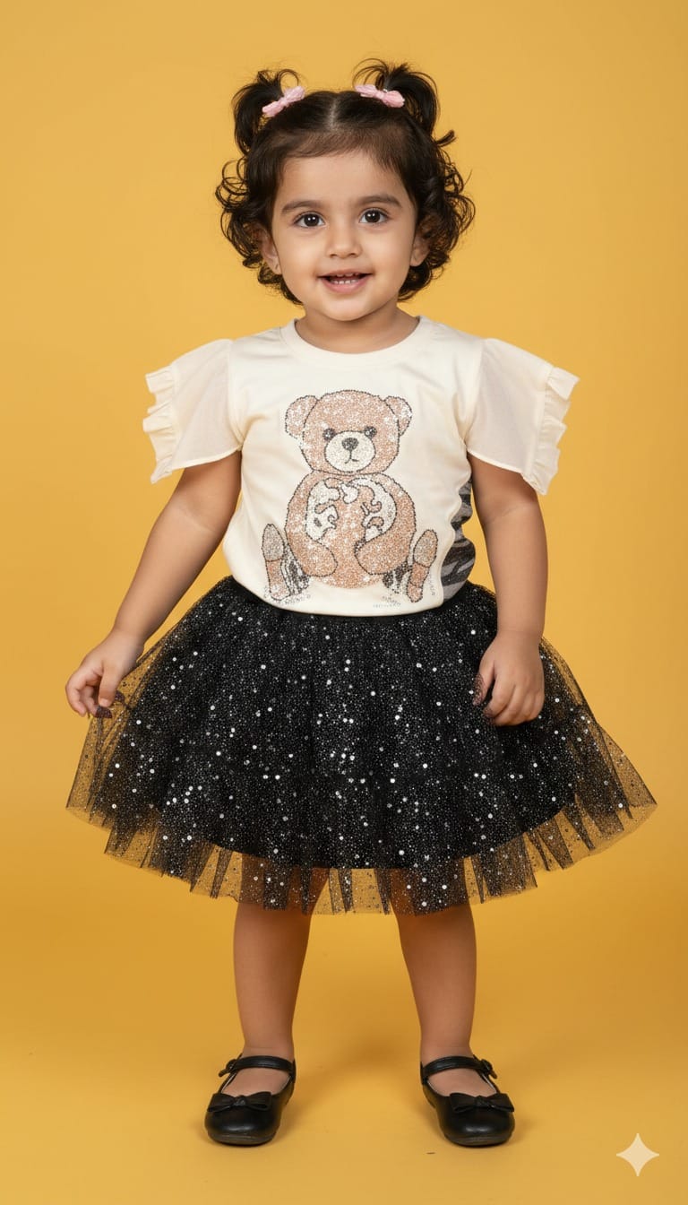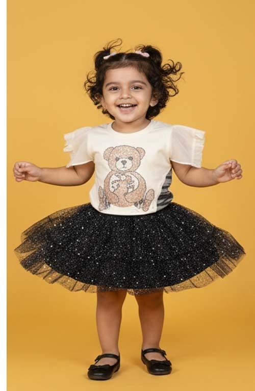 - Color: Cream top with Multi-color Teddy; Black Sparkle Skirt.