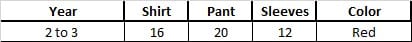 Measurements (Size 16): Shirt length 16″, Pant length 20″, and Sleeves 12″.