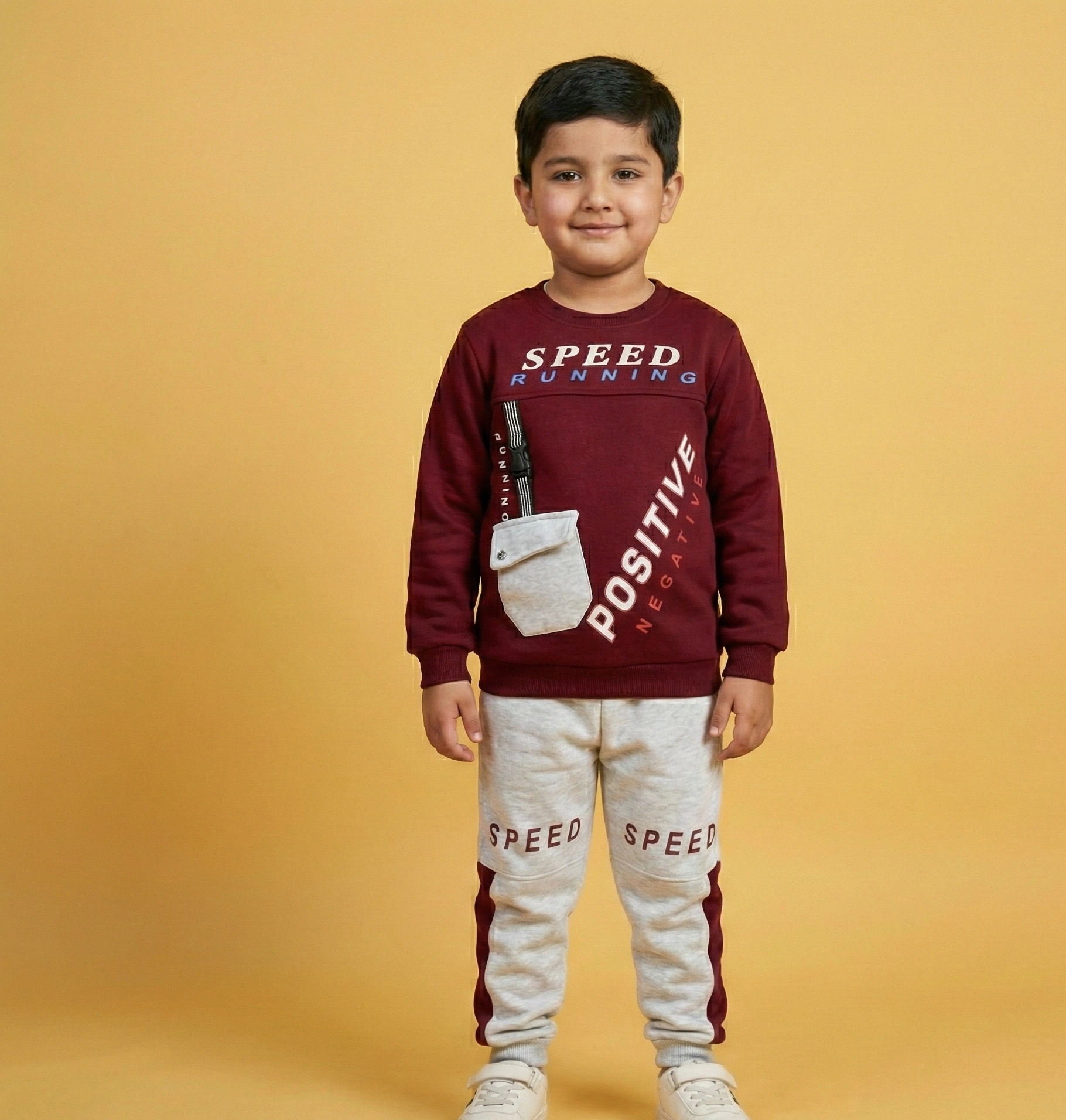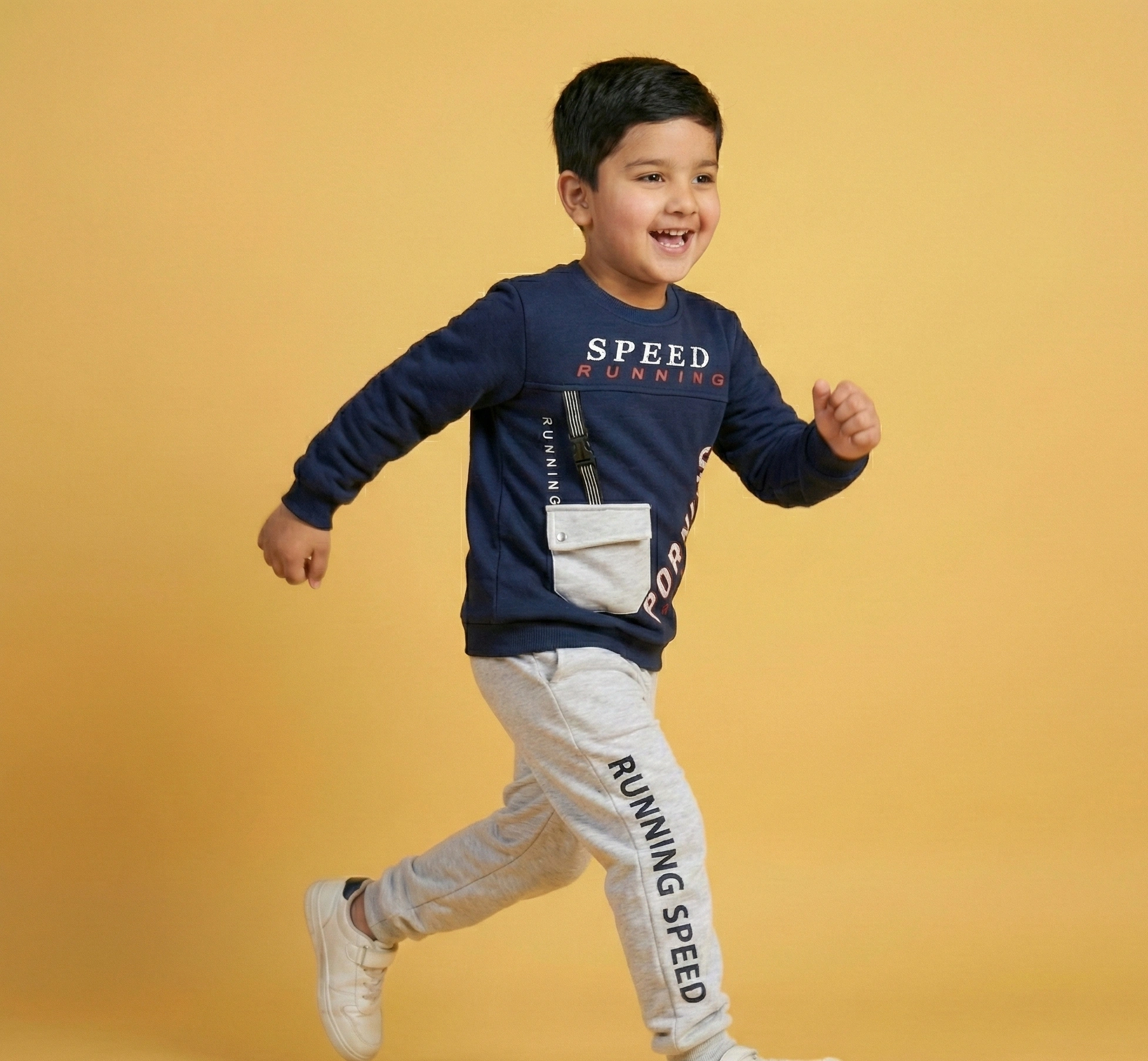 Smart & Sporty Design The sweatshirt stands out with its unique multi-text design and a functional front pocket featuring a tactical buckle. The matching joggers are designed with contrasting side panels and bold typography, ensuring your child looks sharp from every angle.
