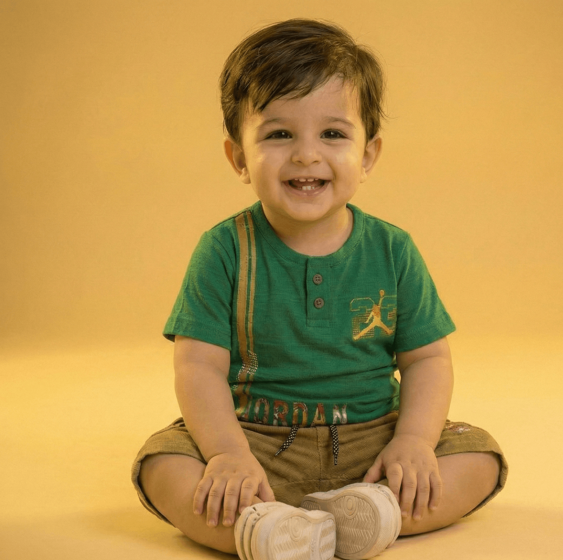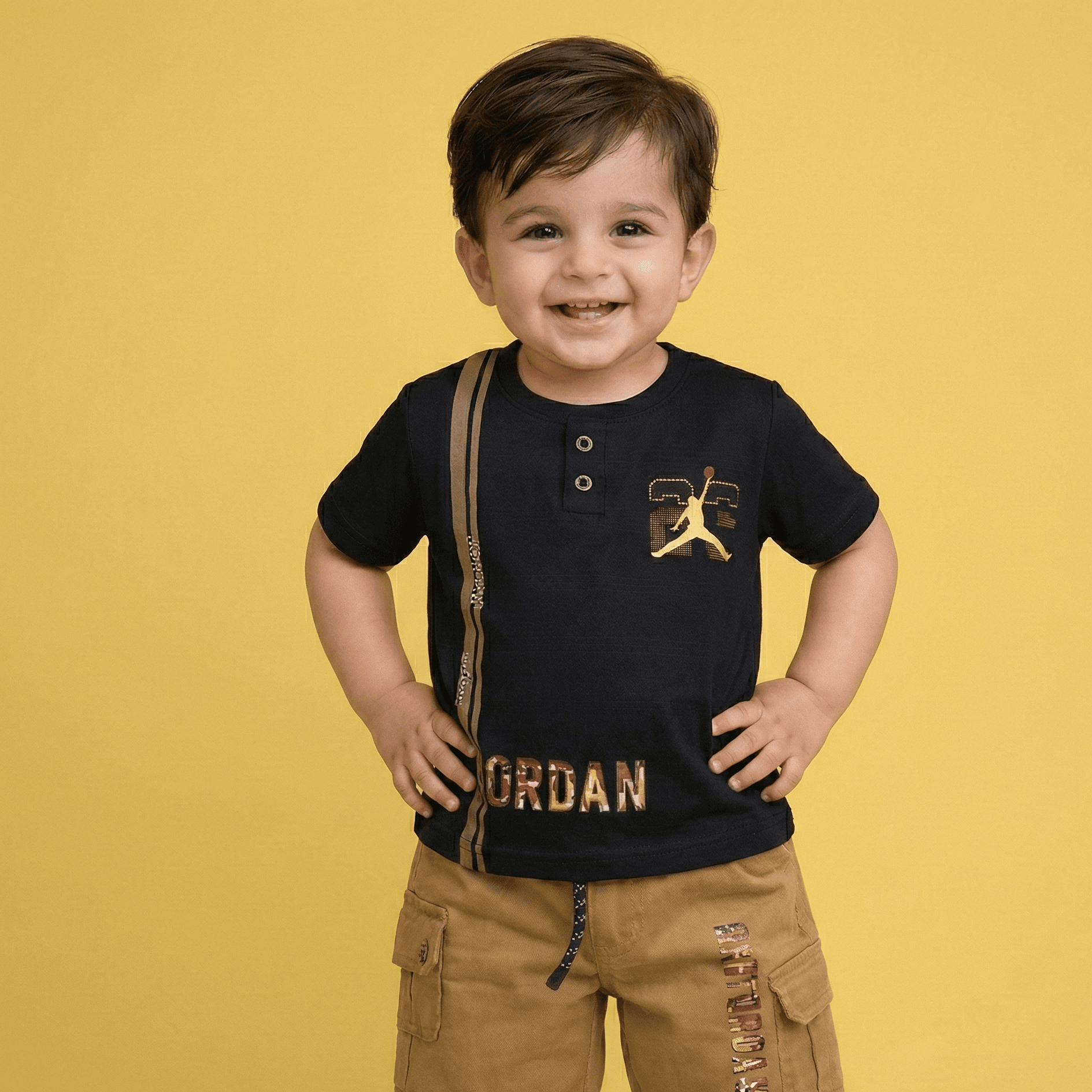 The Tee: Comfort Meets Style The t-shirt is made from ultra-soft, breathable cotton-blend fabric that is gentle on sensitive skin. It features a contemporary print that won’t fade after washing. To make life easier for parents, we’ve added a premium snap-button neckline—no more struggling with tight collars!
