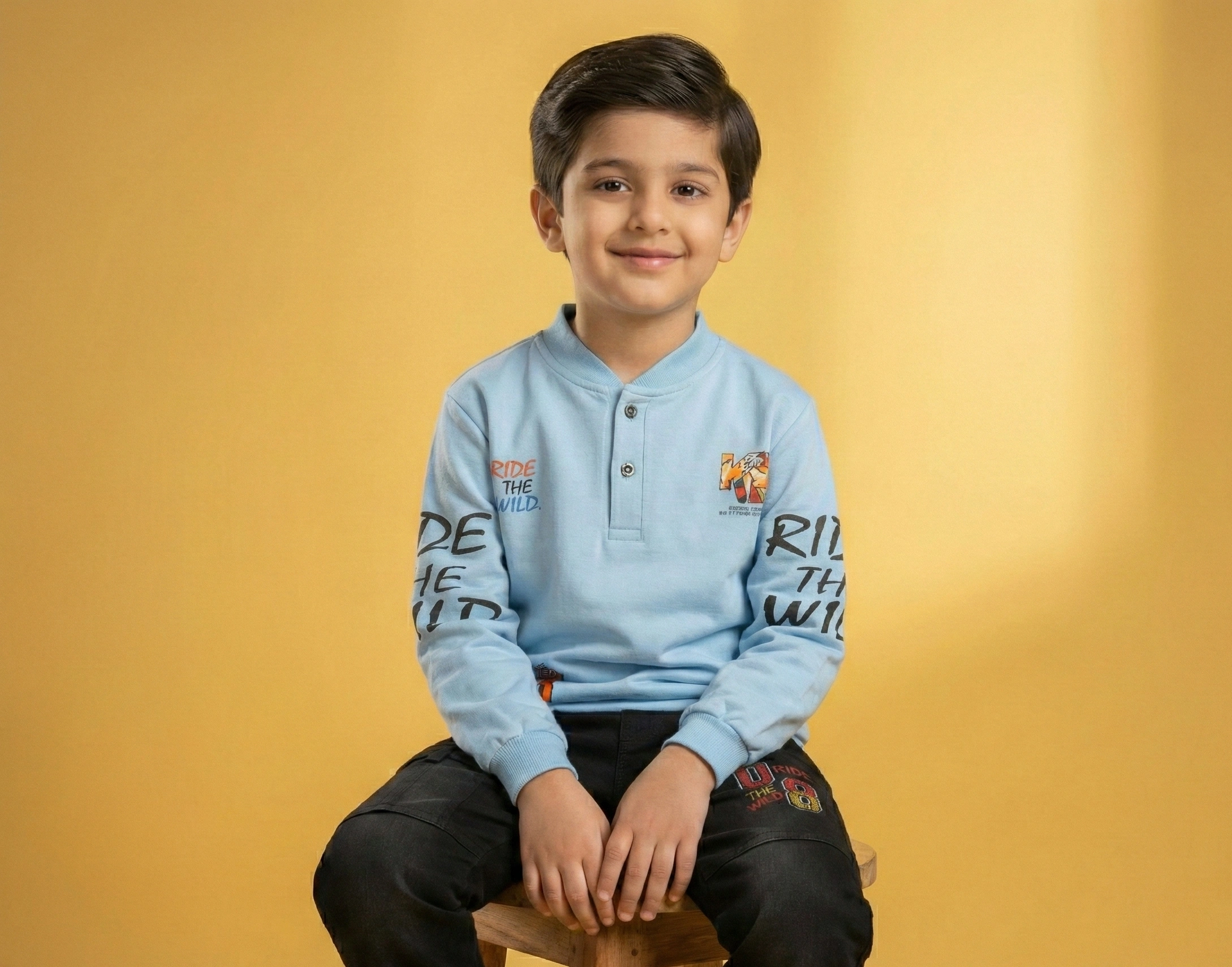 The Pants: Lycra-Infused Denim Forget the discomfort of traditional jeans. Our Lycra Denim is engineered to stretch and move. These deep-black pants feature a trendy washed effect and a comfort-waistband, ensuring your child stays comfortable from morning to night.