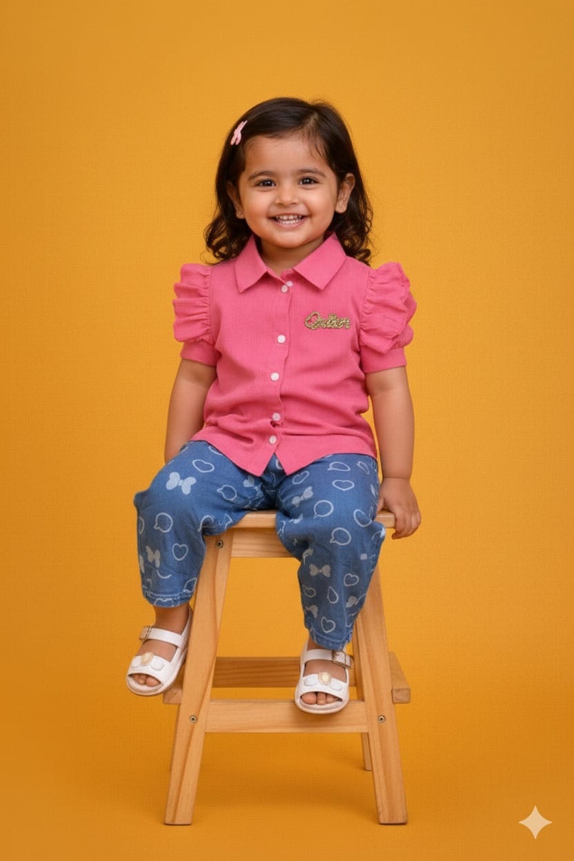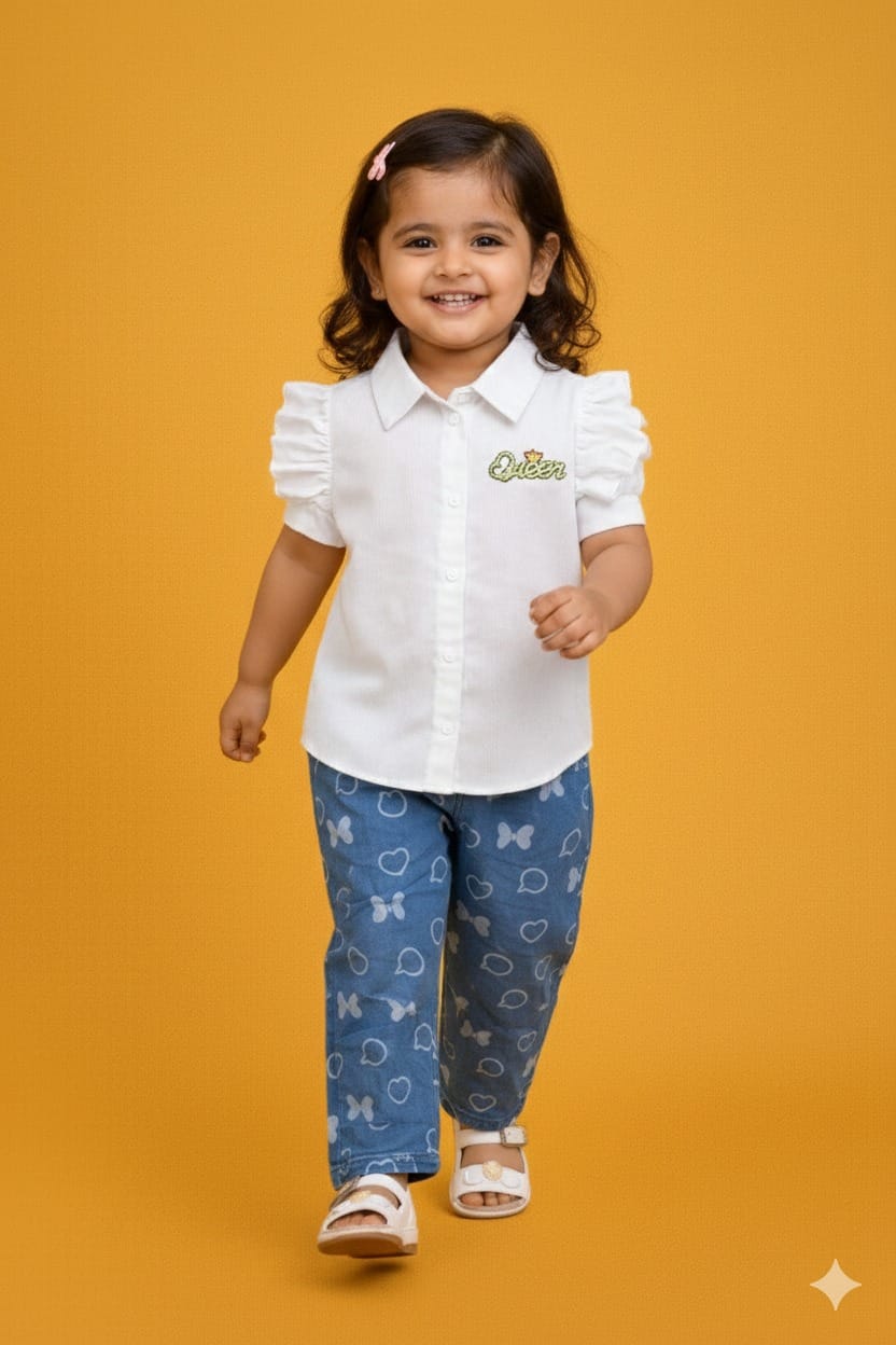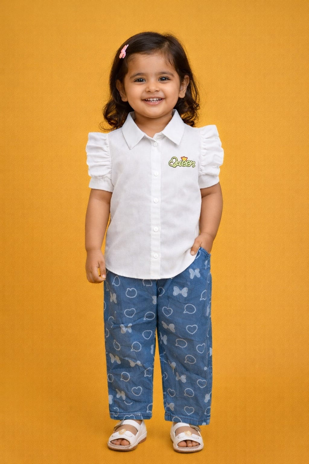 Elegant Design & Playful Patterns The set features a lightweight, front-open chiffon shirt in a striking shade of pink & white. The sleeves are beautifully accented with layered ruffles, adding a touch of sophisticated flair. A shimmering “Queen” brooch sits on the chest, providing a focal point of sparkle. Complementing the top are high-quality denim pants featuring a playful all-over print of white hearts, bows, and speech bubbles.